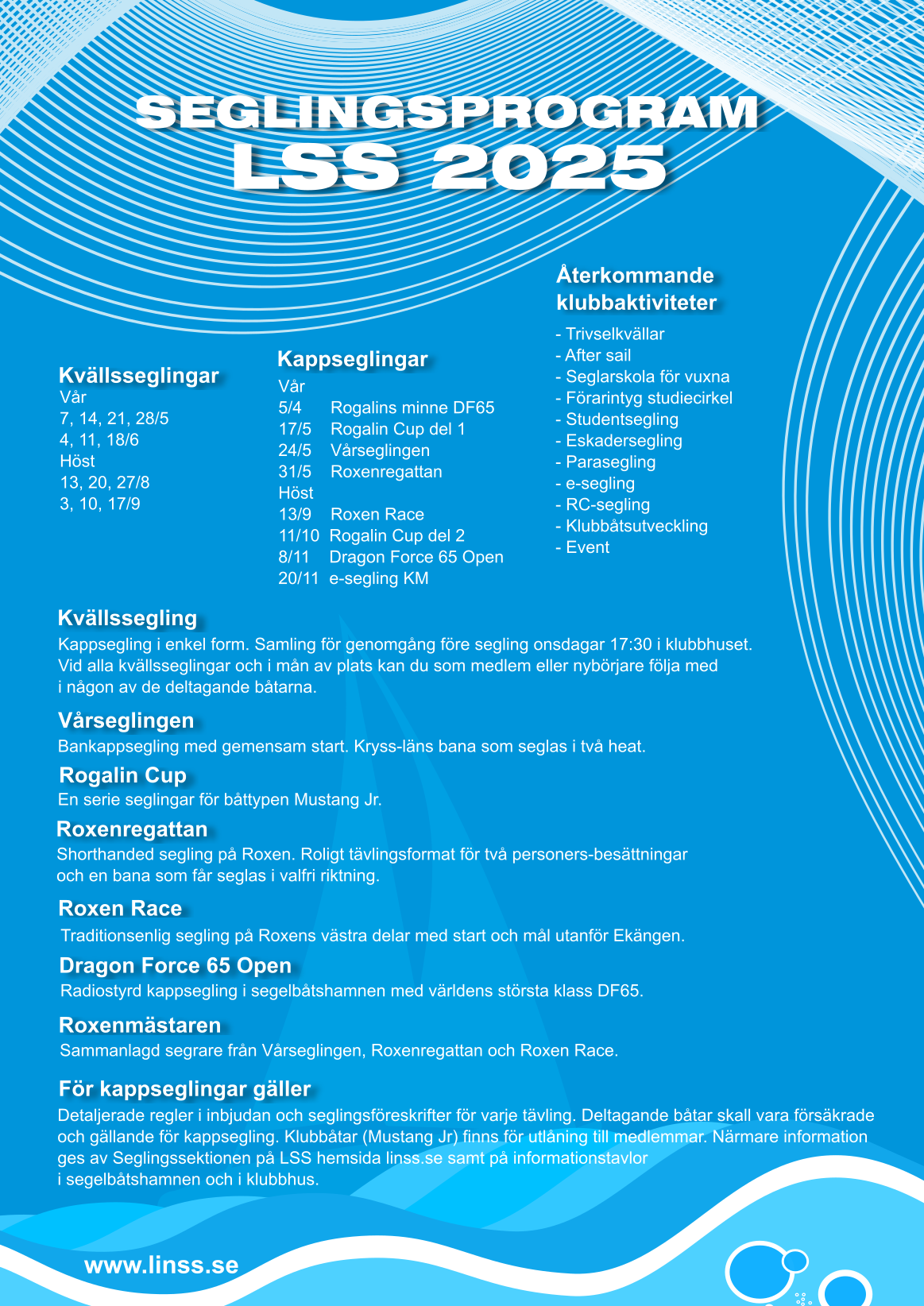 Kappseglingsprogram 2025Nyhet, Segling / Av Torbjörn Gunnarsson / 2025-04-02 Obs ! 5/4 Rogalins Minne kommer att flyttas till annat datum.
